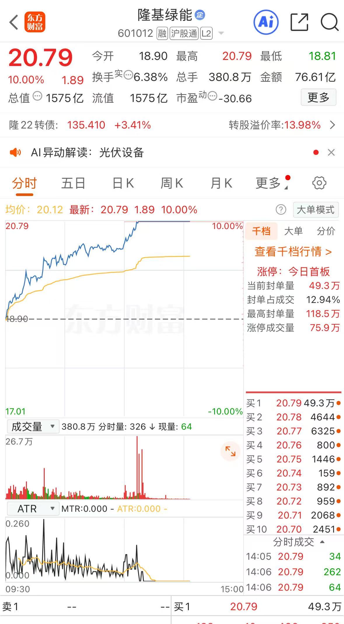截至14點(diǎn),東方財(cái)富數(shù)據(jù)顯示,從板塊來看,午后光伏設(shè)備以4%的漲幅躍居行業(yè)板塊之首,成分股中光伏龍頭企業(yè)隆基綠能“10CM”漲停,陽光能源漲超15%、通威股份漲超9%逼近漲停,大全能源、德業(yè)股份等大市值個(gè)股也隨之大漲,此外,阿特斯、弘元綠能等多只個(gè)股紛紛漲停。