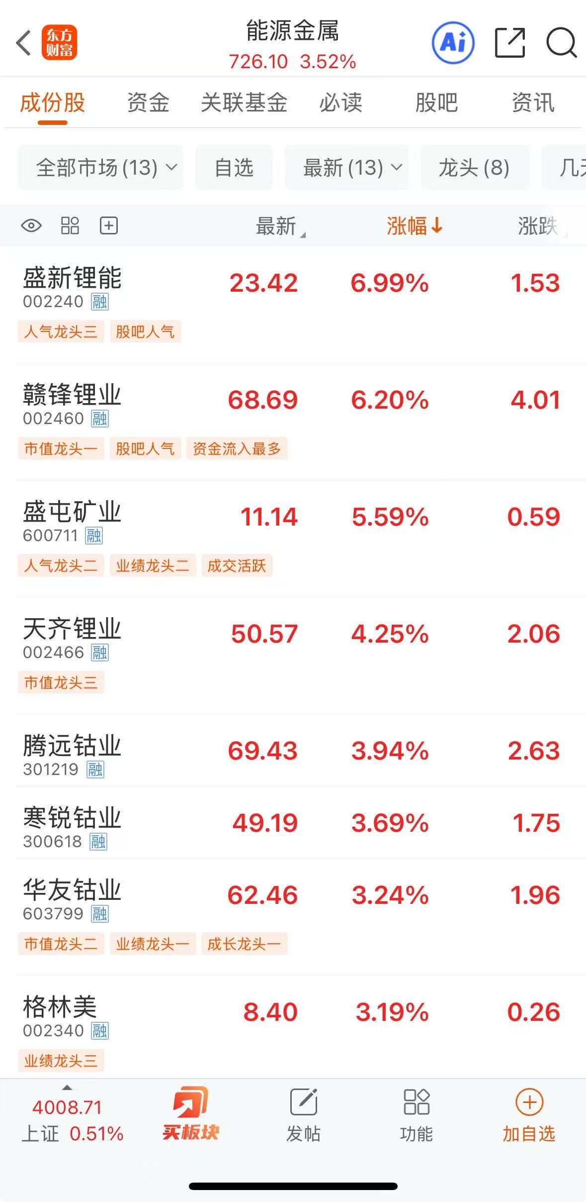 除光伏設(shè)備板塊外,鋰電板塊今日盤中表現(xiàn)也不俗。東方財(cái)富能源金屬板塊13只個(gè)股悉數(shù)飄紅,其中贛鋒鋰業(yè)、盛新鋰能漲超6%,天齊鋰業(yè)、盛屯礦業(yè)等個(gè)股跟漲。
