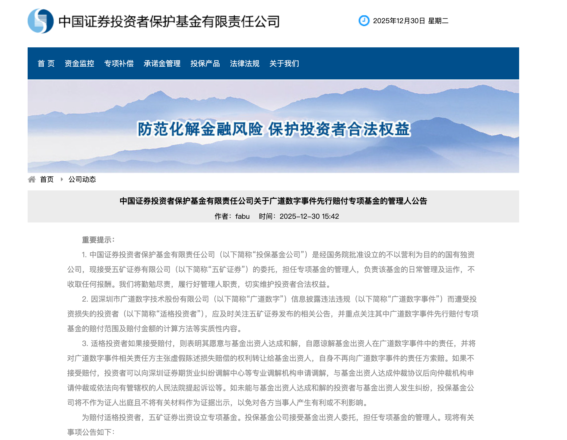 本報(bào)訊 (記者毛藝融)又一先行賠付專項(xiàng)基金設(shè)立。12月30日,中國證券投資者保護(hù)基金有限責(zé)任公司(以下簡稱“投?;鸸?rdquo;)發(fā)布關(guān)于廣道數(shù)字事件先行賠付專項(xiàng)基金的管理人公告。