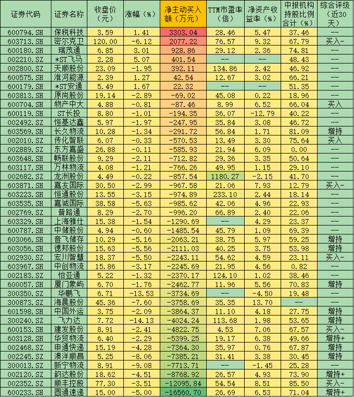 與業(yè)內(nèi)理性分析師對行業(yè)向好判斷相一致的是,在周三板塊下跌過程中,有堅定看好的資金仍在積極買入部分物流股。據(jù)《證券日報》記者通過IFIND統(tǒng)計顯示,周三物流板塊整體凈主動買入額為-10.29億元,不過,有7只個股卻呈凈主動買入狀態(tài),保稅科技(3303.04萬元)、密爾克衛(wèi)(2077.22萬元)等兩只個股凈流入資金均超1000萬元。