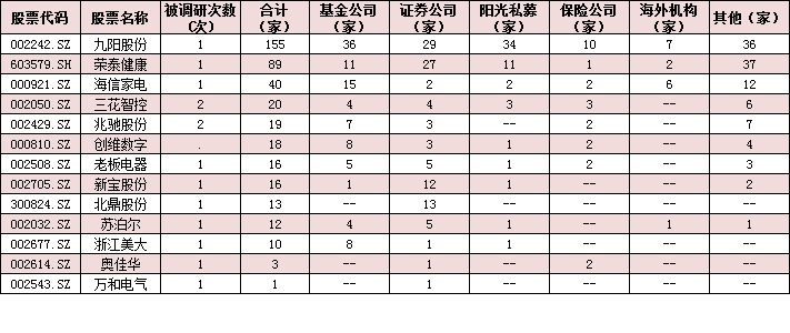 從參與調(diào)研的機(jī)構(gòu)家數(shù)來看,上述13家上市家用電器公司中,九陽股份、榮泰健康、海信家電、三花智控等4家接待調(diào)研機(jī)構(gòu)家數(shù)均在20家及以上,分別為:155家、89家、40家和20家。值得注意的是,在13家獲機(jī)構(gòu)調(diào)研的家用電器公司中,10家為中小創(chuàng)公司,占機(jī)構(gòu)調(diào)研公司比例的77%。