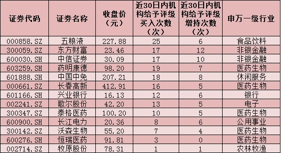 北上資金青睞的個(gè)股,不但受到各方的關(guān)注,同時(shí)也成為各大機(jī)構(gòu)看好的主要對(duì)象。統(tǒng)計(jì)顯示,上述13只個(gè)股,近30日內(nèi),全部被機(jī)構(gòu)給予“買入”或“增持”以上評(píng)級(jí)。其中,五糧液、東方財(cái)富、中信證券、藥明康德、中國中免、長春高新等6家公司被推薦次數(shù)均超過20次以上,后市值得關(guān)注。