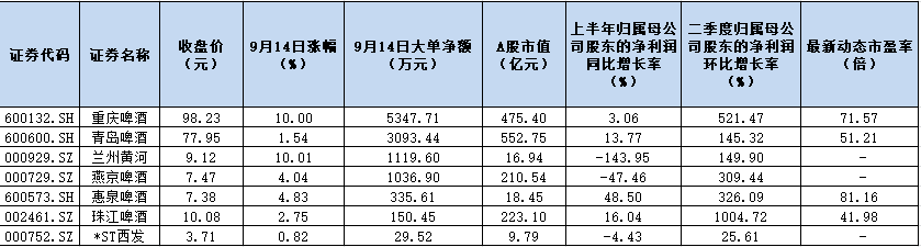表:按9月14日大單資金凈流入排序7只啤酒股市場表現(xiàn)一覽