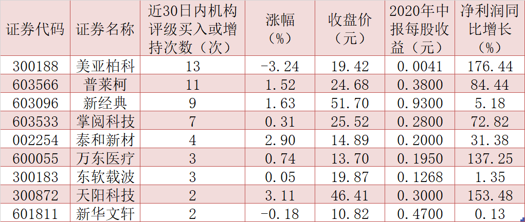 值得一提的是,上述上半年業(yè)績實現(xiàn)同比增長的24家公司后市機會獲得機構(gòu)的高度關(guān)注,美亞柏科、普萊柯、新經(jīng)典、掌閱科技、泰和新材、萬東醫(yī)療、東軟載波、天陽科技和新華文軒等9只業(yè)績增長股近30日內(nèi)被機構(gòu)推薦,后市配置機會優(yōu)勢顯著。