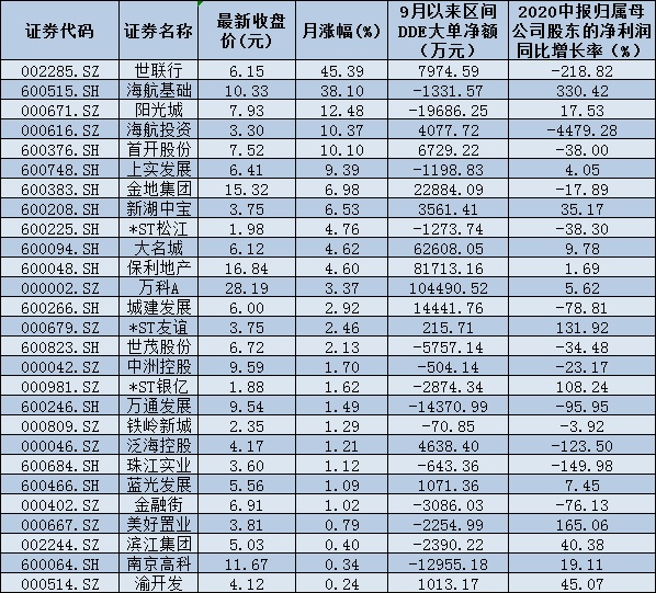 表:9月份以來實現(xiàn)上漲的地產(chǎn)股一覽