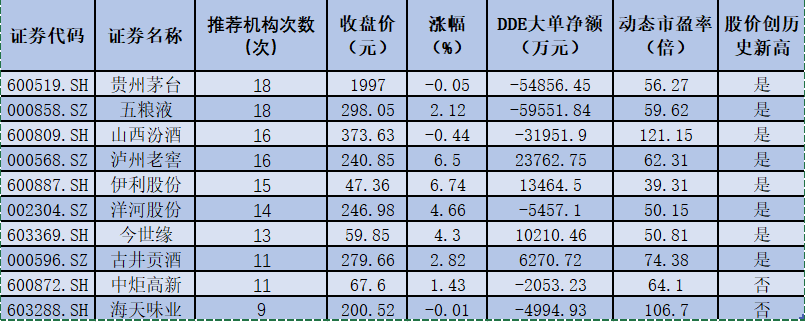 進(jìn)一步梳理發(fā)現(xiàn),食品飲料行業(yè)獲得推薦次數(shù)最多的前十大“金股”分別為貴州茅臺(tái)、五糧液、山西汾酒、瀘州老窖、伊利股份、洋河股份、今世緣、古井貢酒、中炬高新、海天味業(yè)。