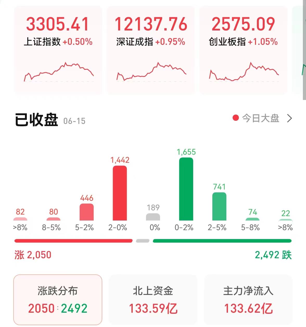 6月15日,三大股指集體收漲,截至收盤(pán),上證指數(shù)0.5%報(bào)3305.41點(diǎn),深成指漲0.95%報(bào)12137.76點(diǎn),創(chuàng)業(yè)板指漲1.05%報(bào)2575.09點(diǎn),上證50指數(shù)漲1.43%;兩市合計(jì)成交12990億元,已連續(xù)4個(gè)交易日突破萬(wàn)億元。北向資金凈買(mǎi)入金額達(dá)133.59億元??傮w來(lái)看,兩市個(gè)股跌多漲少。