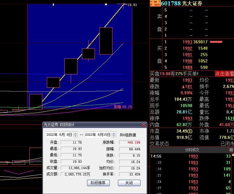 6月15日,熱門(mén)股光大證券再度漲停,截至收盤(pán),報(bào)19.93元,總市值達(dá)918.9億元,實(shí)現(xiàn)六天五板,期間累計(jì)漲達(dá)69.19%。