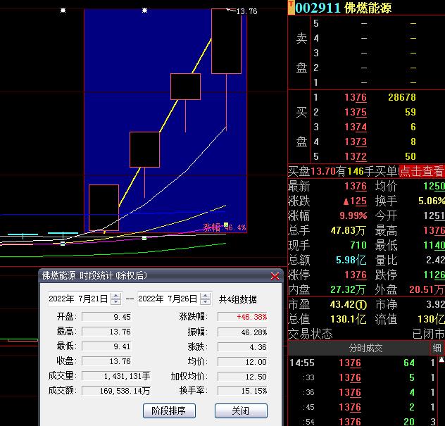 7月26日,佛燃能源再度漲停,截至收盤,報13.76元,連續(xù)4個交易日漲停,期間累計上漲達46.38%。