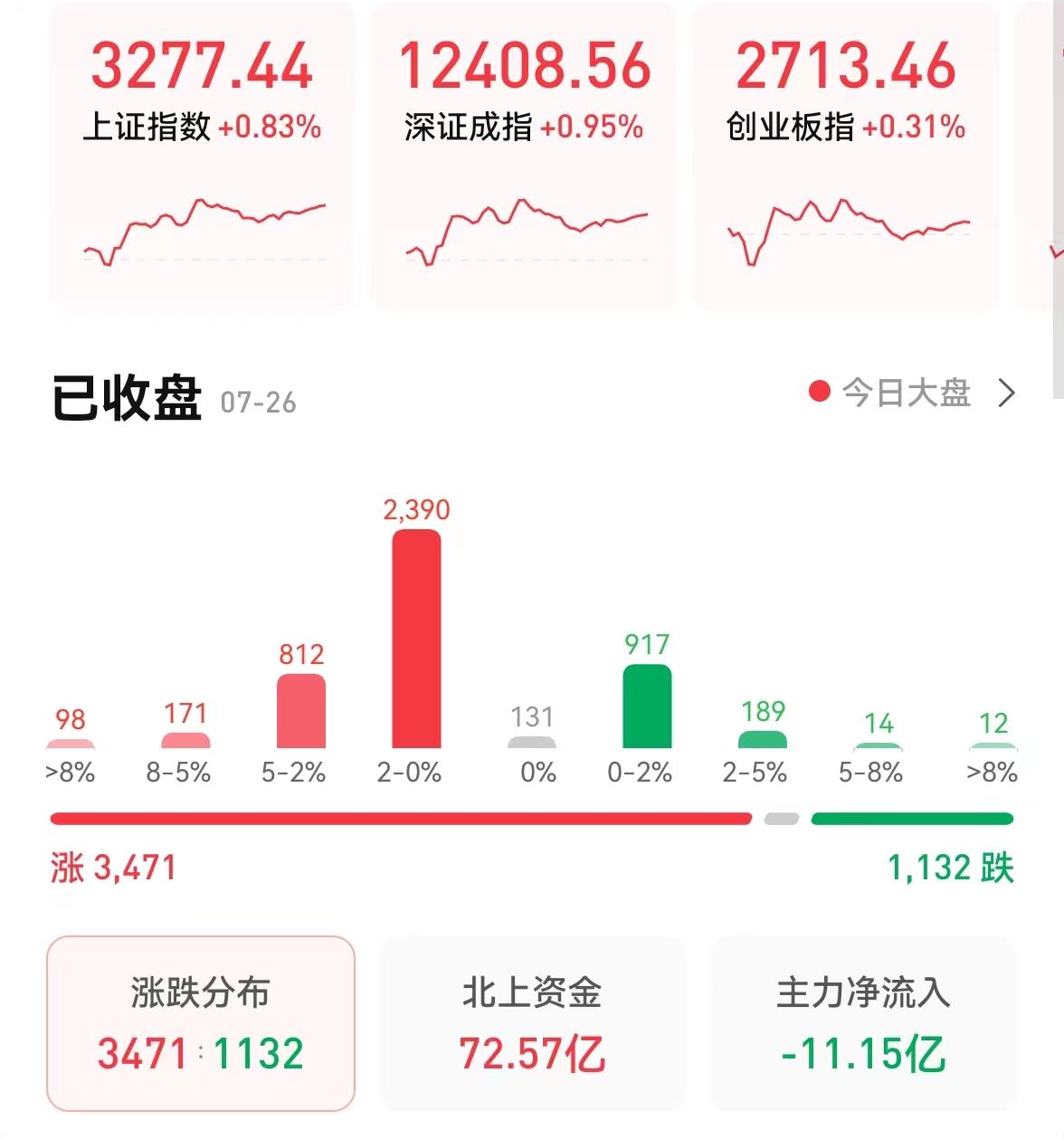 7月26日,A股三大指數(shù)集體收漲,截至收盤,上證指數(shù)漲幅達0.83%報3277.44點,深證成指漲幅達0.95%報12408.56點,創(chuàng)業(yè)板指漲幅達0.31%報2713.46點;兩市合計成交金額達8341億元,北向資金凈買入72.57億元。個股方面,漲多跌少。