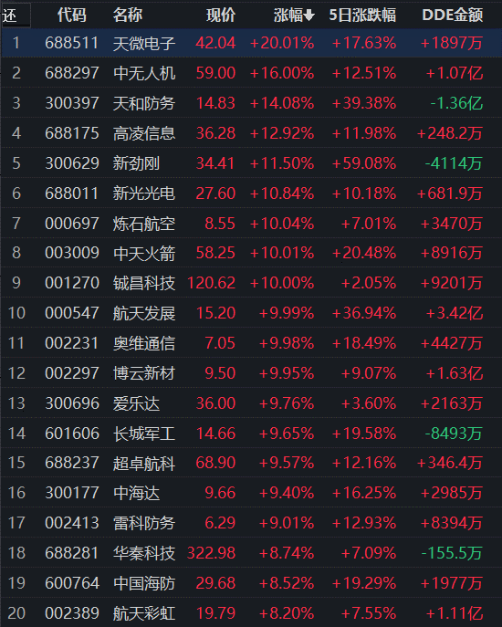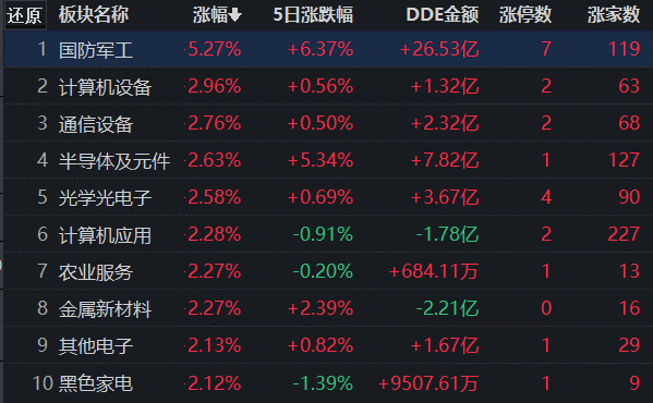 從漲幅居首的國防軍工行業(yè)看,截至8月3日11:30,行業(yè)交易中的125只個股有119只上漲,其中,有7只個股漲停,另有52只個股漲幅超5%。從資金流向看,國防軍工行業(yè)今天上午大單資金凈流入額達26.53億元,居行業(yè)第1位。
