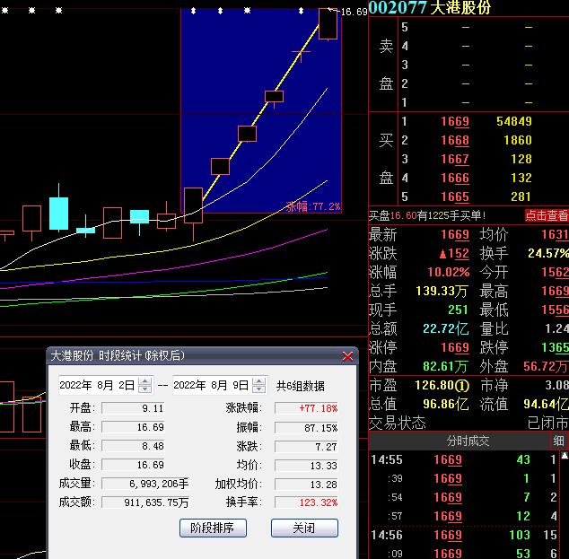 8月9日,熱門芯片股大港股份再度漲停,截至收盤,報16.69元,實現(xiàn)6連板累計漲幅達77.18%。