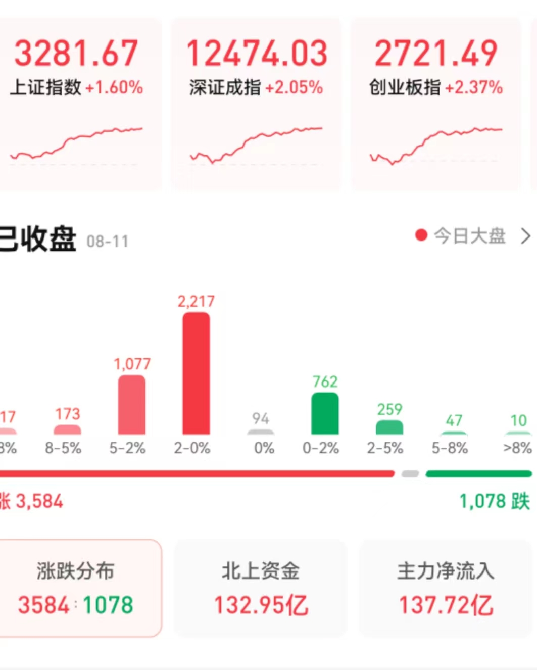8月11日,三大股指全線飄紅,截至收盤,上證指數(shù)漲幅達(dá)漲1.6%報(bào)3281.67點(diǎn),深證成指漲幅達(dá)2.05%報(bào)12474.03點(diǎn),創(chuàng)業(yè)板指漲幅達(dá)2.37%報(bào)2721.49點(diǎn);兩市合計(jì)成交10667億元??傮w來看,A股個股漲多跌少。