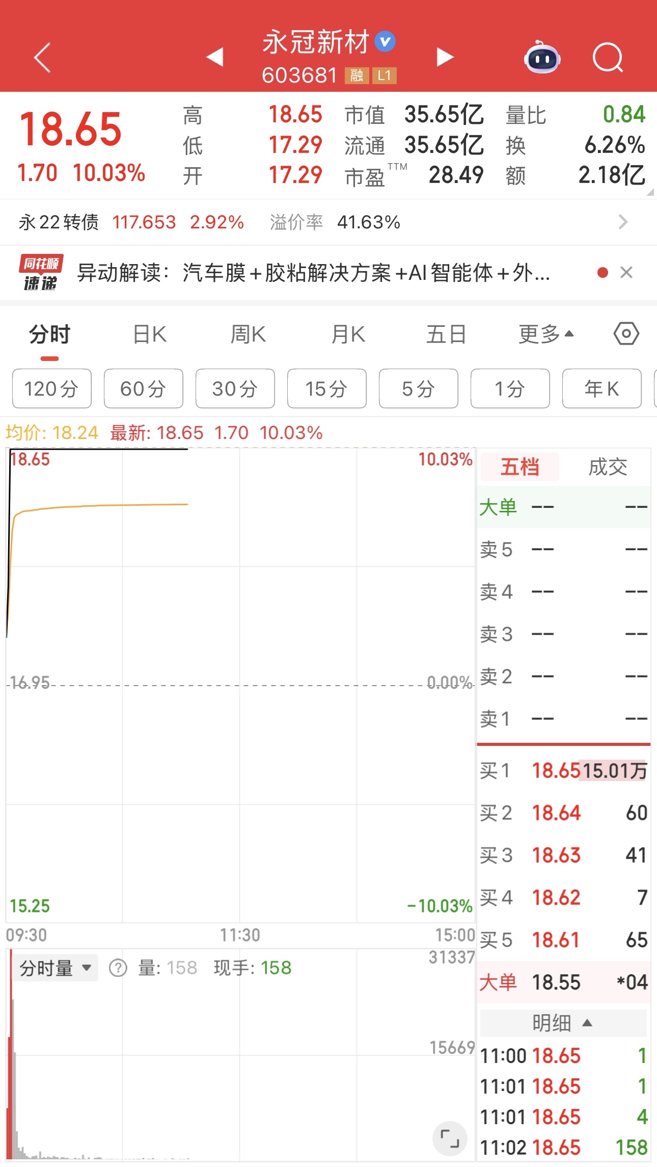 此外,永冠新材(603681)迎來(lái)“7天5板”。截至6月3日上午收盤(pán),永冠新材報(bào)18.65元/股,漲幅10.03%,總市值35.65億元,流通市值35.65億元。