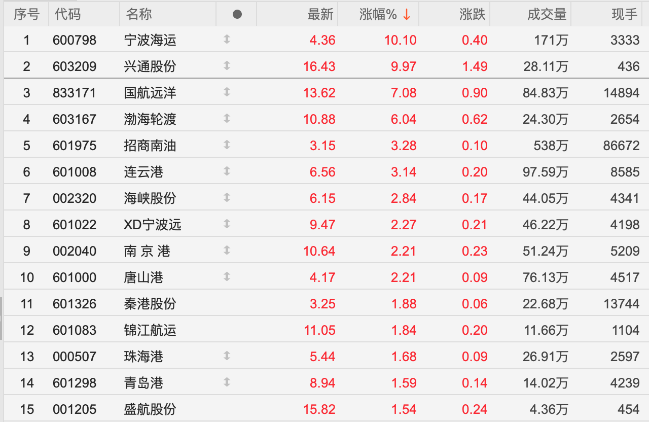 6月20日開(kāi)盤(pán),航運(yùn)港口板塊震蕩拉升。截至當(dāng)日收盤(pán),寧波海運(yùn)(600798)和興通股份(603209)漲停,國(guó)航遠(yuǎn)洋(833171)和渤海輪渡(603167)漲超5%,招商南油(601975)、連云港(601008)、海峽股份(002320)等多股跟漲。