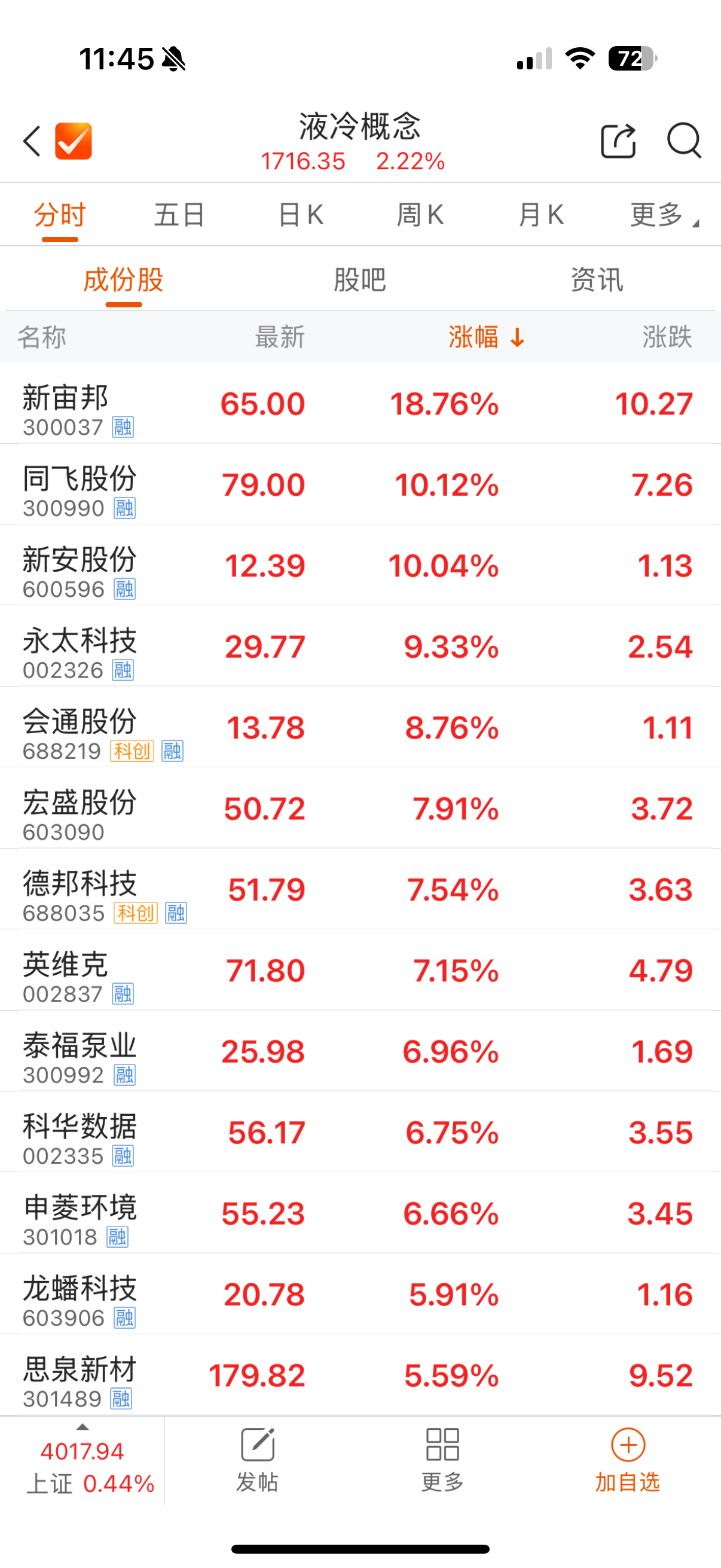 其中,新宙邦(300037)以18.76%的漲幅領(lǐng)漲,超頻三(300647)漲幅達(dá)14.10%,同飛股份(300990)漲超10%,新安股份(600596)漲停,英維克(002837)、申菱環(huán)境(301018)等產(chǎn)業(yè)鏈個(gè)股跟漲。