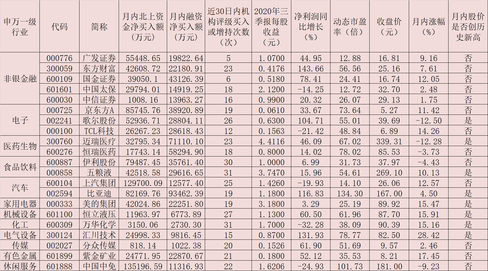 表:11月份以來(lái)獲北上資金及融資客同時(shí)青睞的個(gè)股一覽