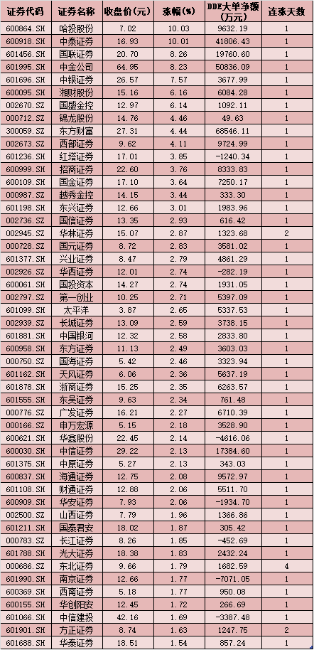 12月17日,券商板塊漲幅達(dá)到3.35%,板塊內(nèi)成份股全線飄紅,哈投股份、中泰證券等兩只個(gè)股聯(lián)袂漲停,國聯(lián)證券、中金公司、中銀證券、湘財(cái)股份、國盛金控、錦龍股份、東方財(cái)富、西部證券等個(gè)股漲幅也均在4%以上。
