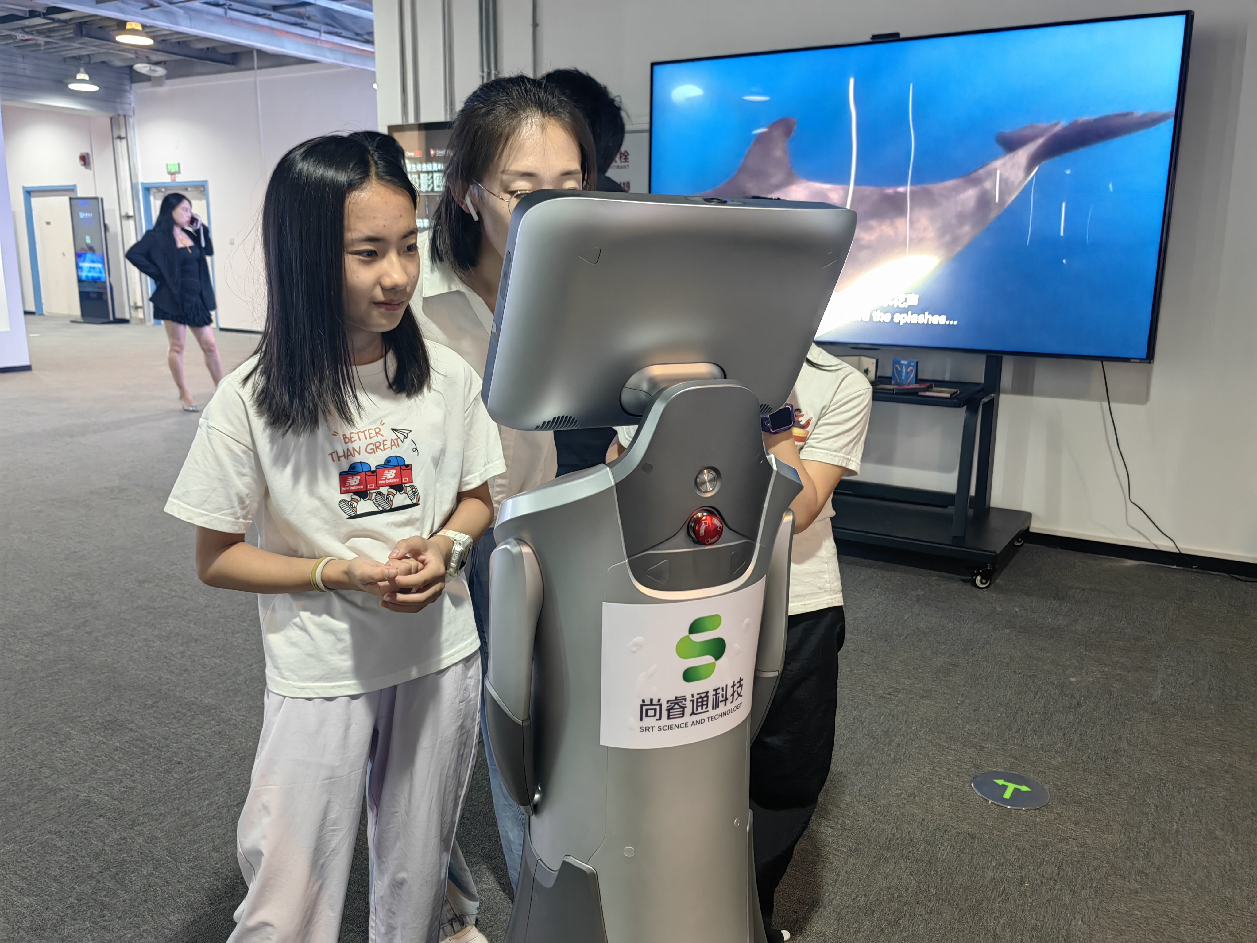 在數(shù)字體驗(yàn)區(qū),一款智能機(jī)器人吸引了眾多孩子的目光,令他們駐足。機(jī)器人向孩子們拋出一個(gè)個(gè)妙趣橫生的問(wèn)題,并巧妙引導(dǎo)他們探尋答案。