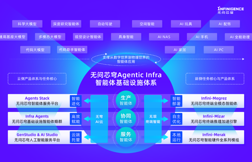 當(dāng)前,秉持“生產(chǎn)智能體、協(xié)同智能體、服務(wù)智能體”理念,無問芯穹進(jìn)一步構(gòu)建了完整的“智能體基礎(chǔ)設(shè)施×(AI云+終端智能)”技術(shù)與產(chǎn)品架構(gòu),支撐數(shù)字世界與物理世界的智能體應(yīng)用效能突破與持續(xù)進(jìn)化。