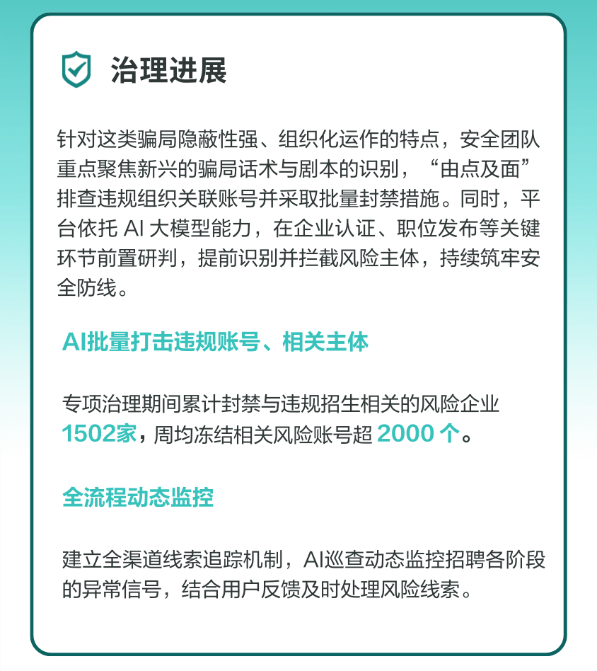 專項(xiàng)治理期間,平臺(tái)持續(xù)強(qiáng)化風(fēng)險(xiǎn)攔截能力,依托“AI大模型語音識(shí)別+人工復(fù)核”雙重體系,對(duì)存在“招轉(zhuǎn)培”風(fēng)險(xiǎn)的企業(yè)主體進(jìn)行識(shí)別與處置。期間平臺(tái)累計(jì)封禁與違規(guī)招生相關(guān)的風(fēng)險(xiǎn)企業(yè)1502家,從源頭防止風(fēng)險(xiǎn)外溢。