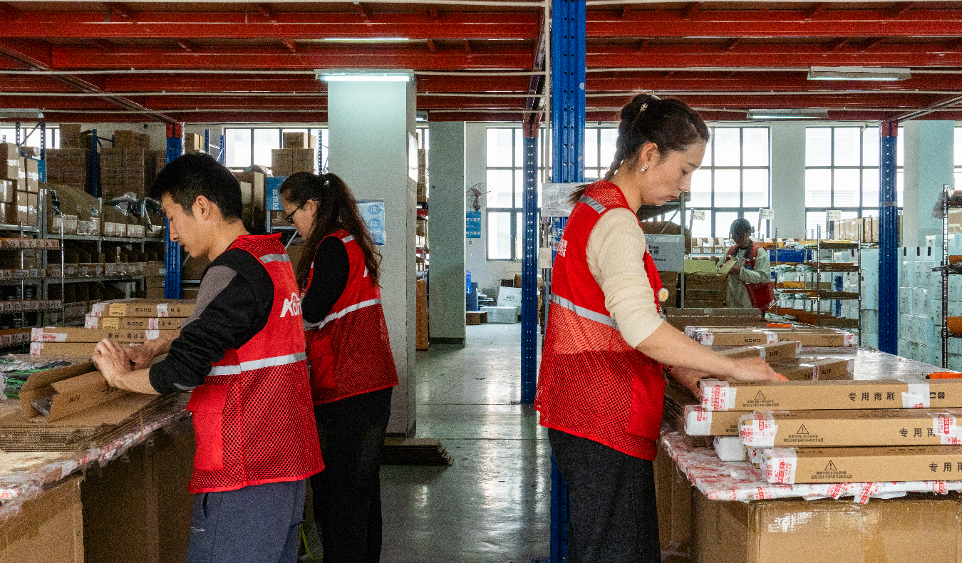 工作人員在倉(cāng)庫(kù)內(nèi)為訂單產(chǎn)品打包發(fā)貨 馬琳|攝
