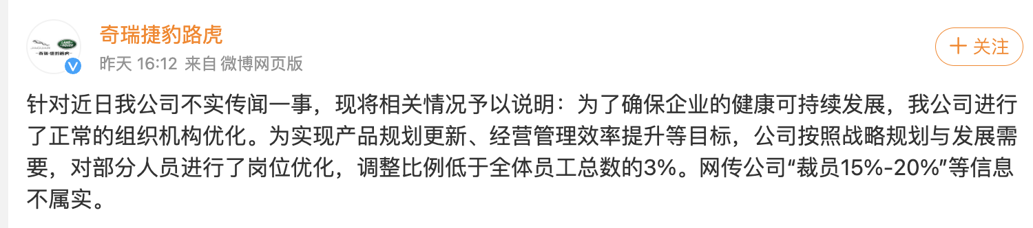 11月8日下午,奇瑞捷豹路虎官微發(fā)布消息,就近日市場不實傳聞進(jìn)行澄清。消息稱,為了確保企業(yè)的健康可持續(xù)發(fā)展,公司進(jìn)行了正常的組織機(jī)構(gòu)優(yōu)化。為實現(xiàn)產(chǎn)品規(guī)劃更新、經(jīng)營管理效率提升等目標(biāo),公司按照戰(zhàn)略規(guī)劃與發(fā)展需要,對部分人員進(jìn)行了崗位優(yōu)化,調(diào)整比例低于全體員工總數(shù)的3%。