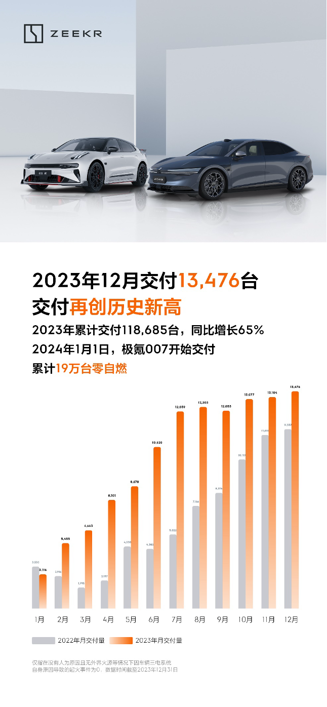 2024年1月1日,極氪智能科技公布最新交付量:極氪2023年12月份交付達(dá)13476臺(tái),再創(chuàng)歷史新高,同比增長(zhǎng)18.9%;年度累計(jì)交付量達(dá)118685臺(tái),同比增長(zhǎng)65%。截至目前,極氪累計(jì)交付突破19萬臺(tái),且零自燃,持續(xù)刷新全球電動(dòng)車安全上限。2024年1月1日,極氪全新車型極氪007將正式開啟交付。