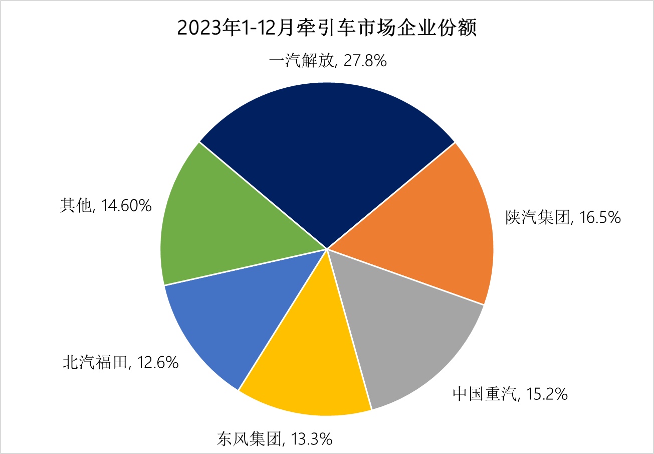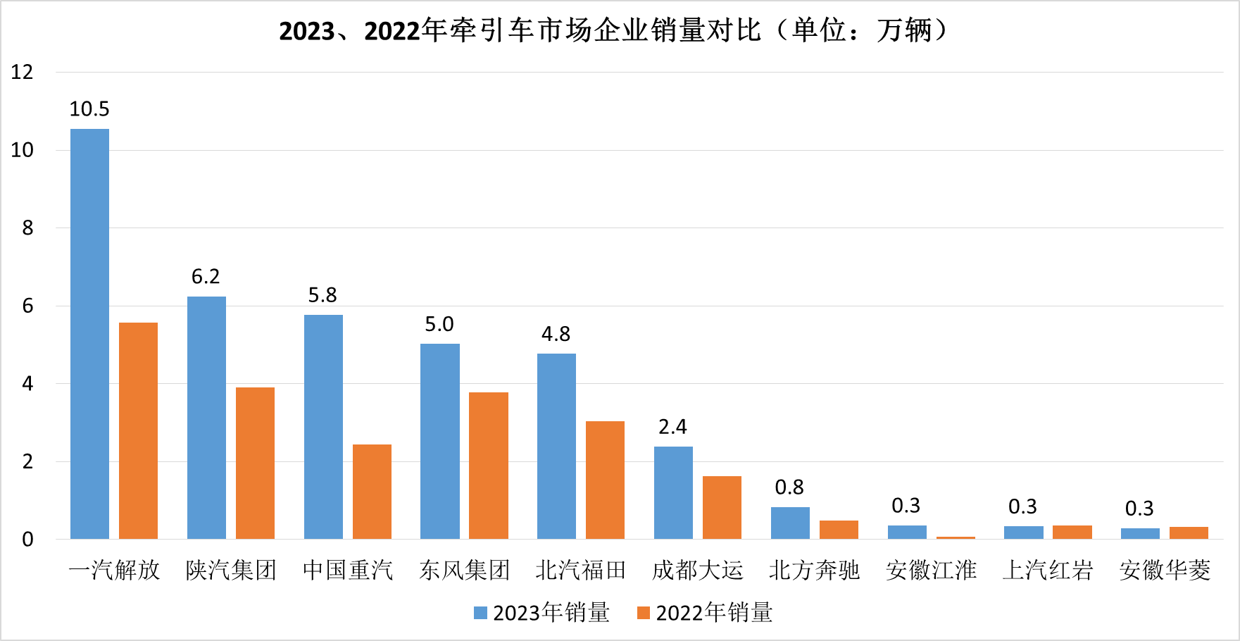 上圖可見,大多數(shù)企業(yè)2023年?duì)恳囦N量都實(shí)現(xiàn)了增長,銷量前十企業(yè)中解放、重汽、陜汽、北方奔馳和安徽江淮增速迅猛,分別增長89.2%、135.8%、60.1%、72.6%和477.9%。在2023年?duì)恳囀袌黾s15.6萬輛的“增量”中,貢獻(xiàn)量最大的是仍是排名首位的解放,牽引車銷量凈增長4.9萬輛,對整個市場增量的貢獻(xiàn)度達(dá)到31%;第二名重汽,凈增長超2萬輛,東風(fēng)、陜汽和福田也均增長超萬輛。