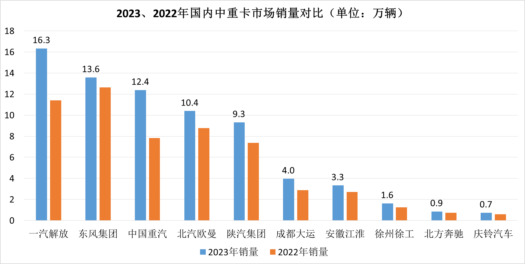 上表可見,在中重卡市場全年收獲超3成增長的大環(huán)境下,絕大多數(shù)企業(yè)都同步實(shí)現(xiàn)了增長。具體來看,2023年中重卡銷量前十家“累計增長”9增1降,實(shí)現(xiàn)增長的企業(yè)增幅均達(dá)到兩位數(shù),重汽、解放、陜汽、大運(yùn)和北奔等企業(yè)增幅高于中重卡市場整體33%的增幅,跑贏“大盤”,排名前兩位的重汽和解放中重卡銷量同比分別大增49%和46%,對2023年中重卡市場的增長貢獻(xiàn)最大。