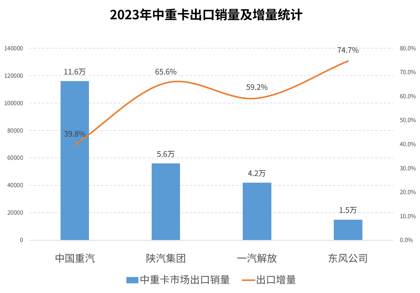 除了上述國內(nèi)幾個熱點(diǎn)市場外,出口也是2023年中重卡乃至整個汽車市場的一大亮點(diǎn),中國商用車企業(yè)憑借優(yōu)異的產(chǎn)品,積極走出國門,向全世界展示其發(fā)展成就。據(jù)中汽協(xié)數(shù)據(jù)顯示:2023年我國汽車出口延續(xù)快速增長,商用車出口77萬輛,同比增長32%。中重卡市場,重汽出口銷量以11.6萬輛位居首位;陜汽、解放位居其后,出口銷量分別為5.6萬輛和4.2萬輛;重汽、解放、東風(fēng)、陜汽的出口增量分別達(dá)到39.8%、59.2%、74.7%、65.6%,四大商用車巨頭均跑贏“大盤”。