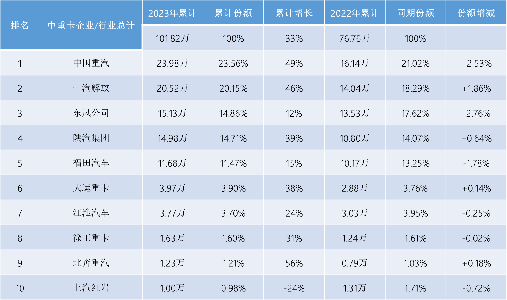 2023年1-12月中重卡市場銷量表(單位:輛)