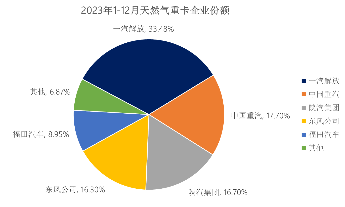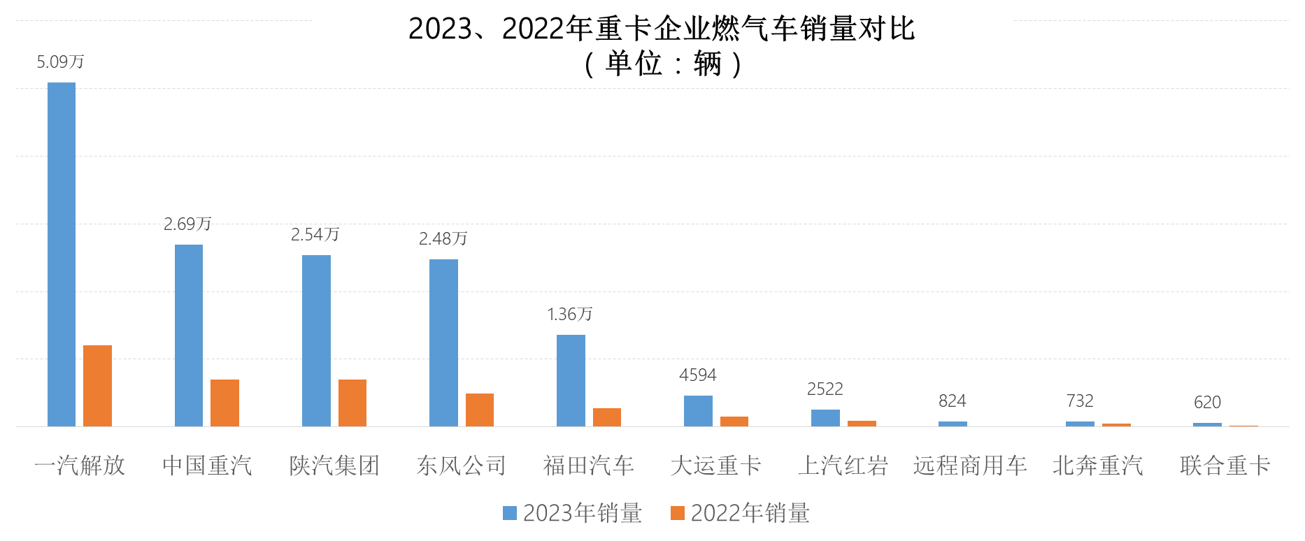 上圖可見,銷量前五企業(yè)中,解放、東風(fēng)和福田高于此增幅,分別增長323%、407%和390%。2023年天然氣重卡市場約11.5萬輛的“增量”中,主要由排名靠前的企業(yè)貢獻(xiàn),貢獻(xiàn)最大的是排名第一的解放,燃?xì)廛噧粼鲩L3.88萬輛,對整個市場增量的貢獻(xiàn)度超過1/3;重汽、陜汽、東風(fēng)和福田也均增長超萬輛。