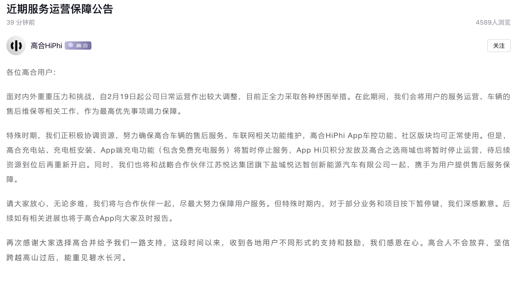 據(jù)高合汽車發(fā)布的最新公告,公司正積極協(xié)調資源,努力確保高合車輛的售后服務、車聯(lián)網(wǎng)相關功能維護,高合HiPhiApp車控功能、社區(qū)版塊仍可正常使用。但是,高合充電站、充電樁安裝、App端充電功能(包含免費充電服務)將暫時停止服務,AppHi貝積分發(fā)放及高合之選商城也將暫時停止運營,待后續(xù)資源到位后再重新開啟。