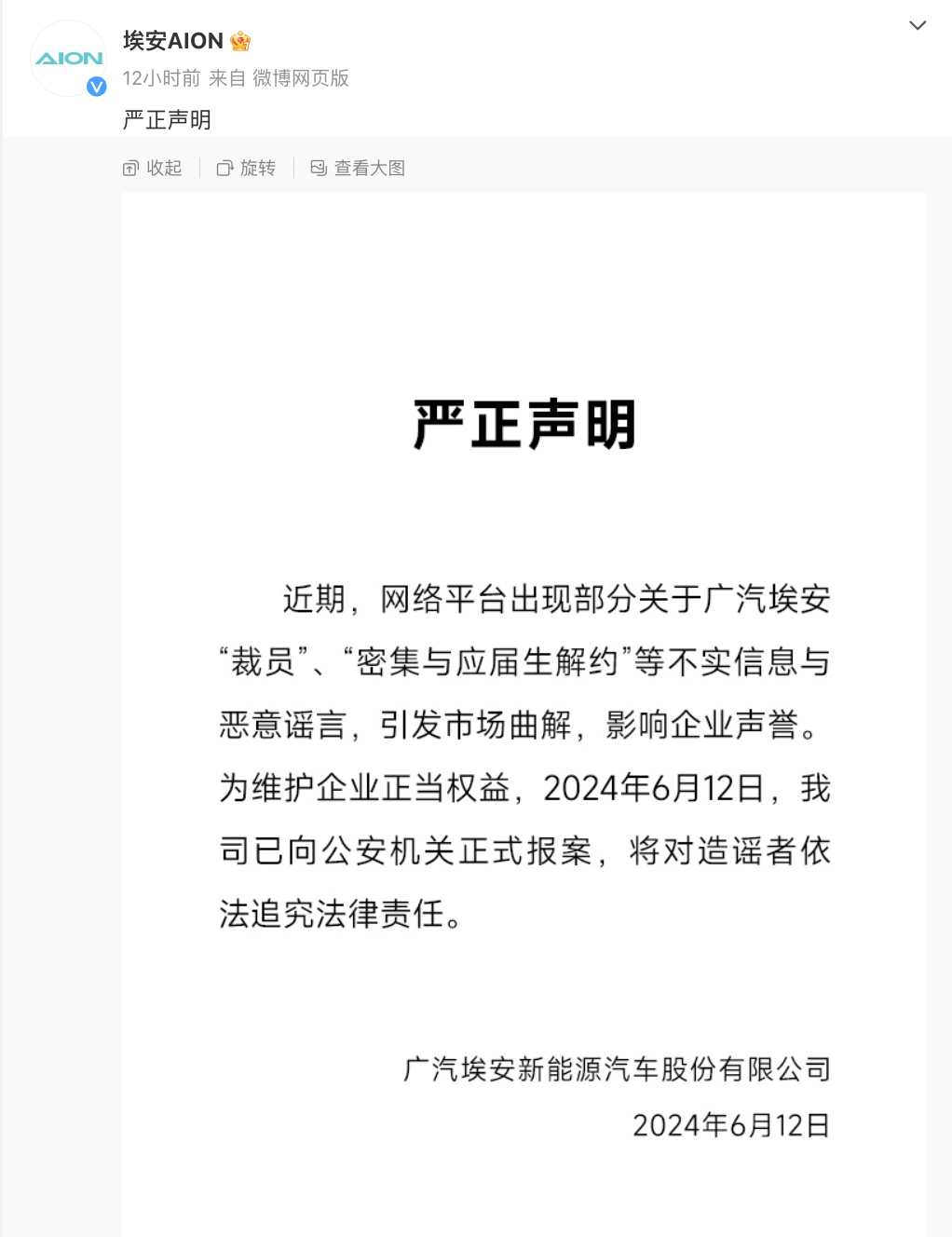 廣汽埃安稱,為維護企業(yè)正當權益,2024年6月12日,已向公安機關正式報案,將對造謠者依法追究法律責任。
