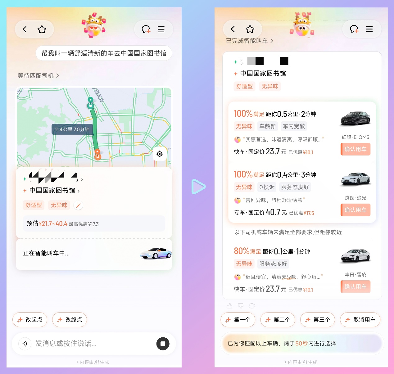 除了一句話選車,小滴也在向更完整的出行助手延展。它也支持查詢附近地點并一鍵叫車、推薦遠距離行程的換乘方案,以及查詢訂單、預(yù)約叫車等功能。