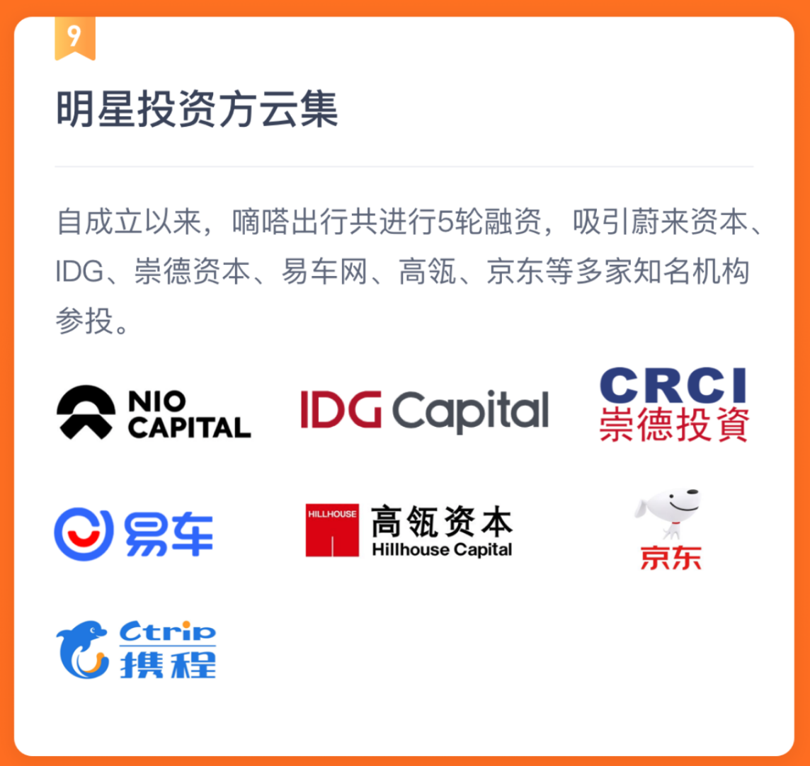 作為中國(guó)第二大順風(fēng)車平臺(tái),嘀嗒出行擁有豪華股東陣容,吸引多家知名投資機(jī)構(gòu)和企業(yè)參投,包括蔚來(lái)資本、IDG、CRCI、易車網(wǎng)、高瓴、京東及攜程等。