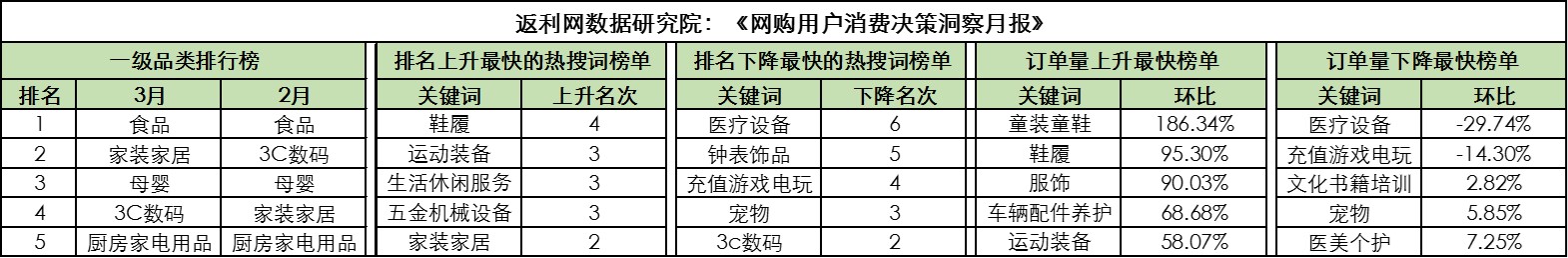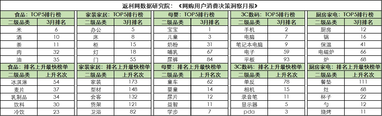 返利網數據研究院的相關負責人表示,食品、辦公、母嬰等品類的訂單量排名都在上漲,這也印證了混合辦公形勢下,剛需消費需求正在復蘇。此外,“盡管整個3月份3C數碼消費雖有所下滑,但3月下旬以來,華為、小米等產商陸續(xù)發(fā)布了新品,隨著產能復蘇,消費信心也在逐步恢復,我們對4月份的3C數碼品類還是充滿期待。”