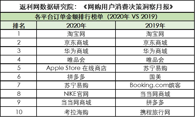 從平臺分布上看,淘寶、京東和華為商城依然穩(wěn)居平臺訂單金額前三,相比2019年,只有華為商城入榜前十,2020年,蘋果官網首度挺進前五,NIKE官網位居第八,品牌商城占據了前十榜單的1/3,品牌商城強勢崛起。而去年位居前十的旅行類網站Booking.com繽客和攜程旅行網,受疫情影響均跌出了前十。