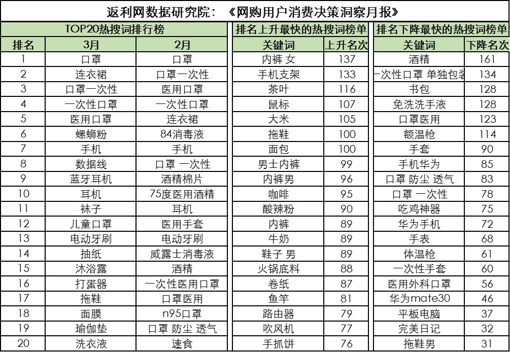 月報顯示,相較2月,消毒液、酒精等防疫相關搜索詞已跌出了“TOP20熱搜榜”,酒精、洗手液和額溫搶等搜索詞熱度排名均在百名以外,防疫需求顯著下滑。