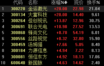 元宇宙概念持續(xù)沖高,金運(yùn)激光(22.980,3.83,20.00%)、大富科技(14.400,2.40,20.00%)拉升封板。