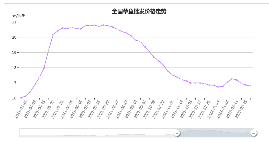 全國(guó)草魚(yú)批發(fā)價(jià)格尚處于低位(國(guó)家商務(wù)部數(shù)據(jù)中心)