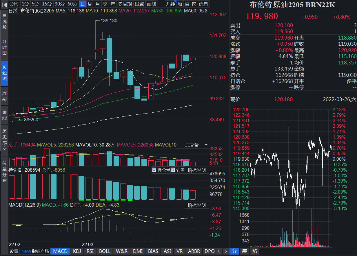 本周(3月21日至3月25日),國際油價結(jié)束了連續(xù)兩周的下跌行情,實現(xiàn)上漲。截至3月25日收盤,5月份交貨的NYMEXWTI原油期貨期間累計上漲9.02%,收于112.60美元/桶;5月份交貨的布倫特原油期貨期間累計上漲10.89%,收于119.98美元/桶;上期所原油期貨主力合約本周也累計上漲了7.21%,收于734.5元/噸。