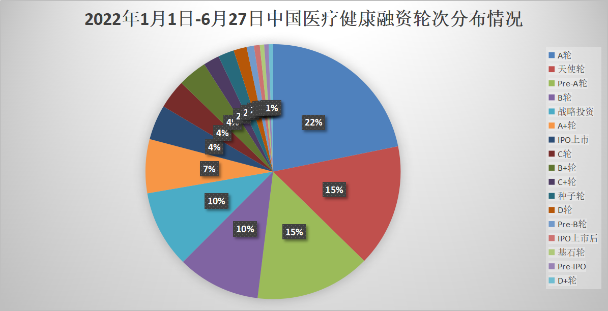 從融資輪次分布來(lái)看,早期項(xiàng)目更受資本關(guān)注。2022年上半年,A輪融資事件出現(xiàn)頻次最高,占比22%,其次是天使輪和Pre-A輪,分別占比15%。
