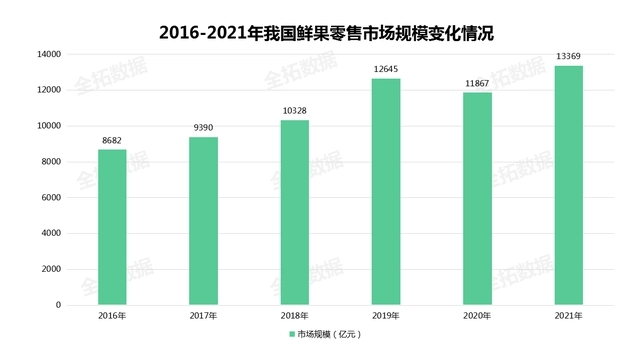 全拓?cái)?shù)據(jù)顯示,2016至2021年間,我國鮮果零售行業(yè)市場規(guī)模雖有所波動(dòng),但整體呈現(xiàn)增長態(tài)勢。2020年受到疫情影響其市場規(guī)模有所降低,到2021年隨著國內(nèi)經(jīng)濟(jì)的回暖鮮果零售市場規(guī)模也逐漸回升至13369億元。