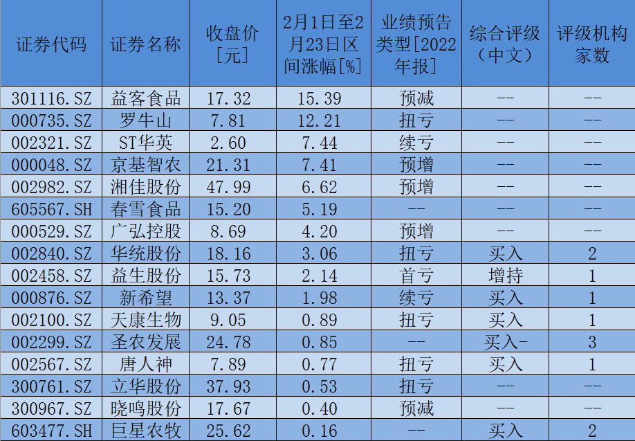 表:2月1日至2月23日,養(yǎng)雞概念板塊期間實(shí)現(xiàn)上漲個股一覽。