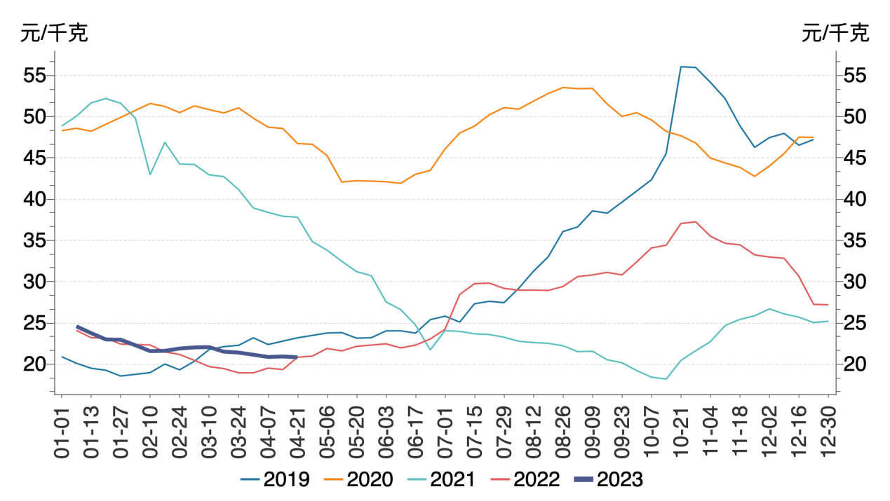 從根本上來講,豬肉的供需影響豬肉價格走勢。在需求端,短期來看,屠宰企業(yè)凍品入庫數(shù)量增多對豬價的低位企穩(wěn)形成一定支撐。尤其是在2月底,涌益咨詢的數(shù)據(jù)顯示,凍品庫容率達到28.9%,環(huán)比上漲10個百分點左右,創(chuàng)近5年同期高位;此外,在豬糧比持續(xù)低于5:1的情況下(6:1通常是盈虧平衡點),國家發(fā)改委于2月17日發(fā)布公告,擬收儲2萬噸豬肉,雖然成交不旺,但此舉對于提振市場信心起到積極的作用。中長期來看,經(jīng)濟的逐步復(fù)蘇將對豬肉的需求形成有力支撐。3月份社零額同比增長10.6%,雖然社零額的增速比市場預(yù)期高出3.4個百分點,但3月季調(diào)的環(huán)比增速僅為0.15%,遠低于2021年0.93%和2020年0.87%的增速,反映出當前的消費仍然處于溫和復(fù)蘇狀態(tài),伴隨著經(jīng)濟的弱復(fù)蘇延續(xù),年內(nèi)消費的復(fù)蘇仍將持續(xù),雖然難以出現(xiàn)消費過熱狀態(tài),但整體消費需要有望逐步轉(zhuǎn)暖,從而對豬肉的消費形成一定支撐。