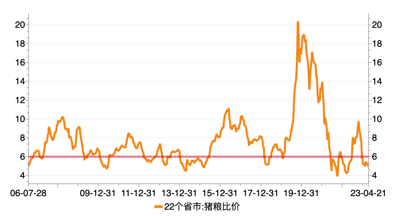 在供給端,短期來看,盡管2023年初以來的豬糧比持續(xù)在6以下區(qū)間運行(見圖5),生豬養(yǎng)殖持續(xù)虧損,但養(yǎng)殖端的扛價意愿較強,能繁母豬數(shù)量未出現(xiàn)大幅壓降,壓欄和二育有抬頭的趨勢,豬肉的供給壓力被后置。從歷史的規(guī)律來看,能繁母豬數(shù)量與豬肉價格成反比,能繁母豬數(shù)量高企時,豬肉價格通常處于低位(見圖6)。雖然當前能繁母豬數(shù)量仍然處于高位,但中長期來看,能繁母豬數(shù)量有望隨著豬價的觸底回升而減少,連鎖反應(yīng)將導(dǎo)致供給端出現(xiàn)相應(yīng)收縮。
