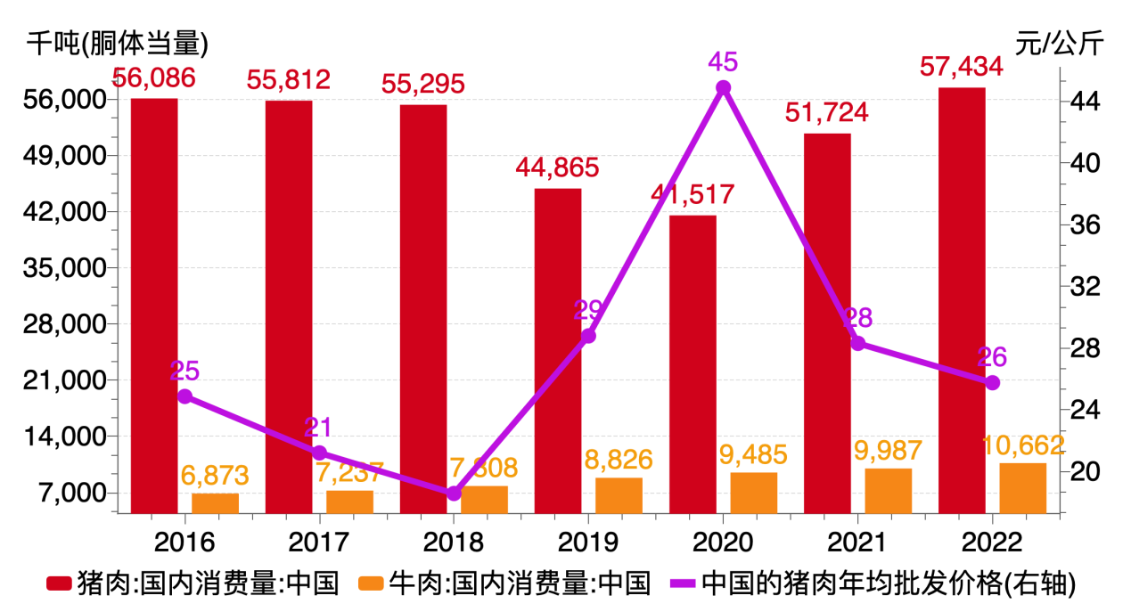 圖2:2022年中國豬肉、牛肉消費量及豬肉價格走勢