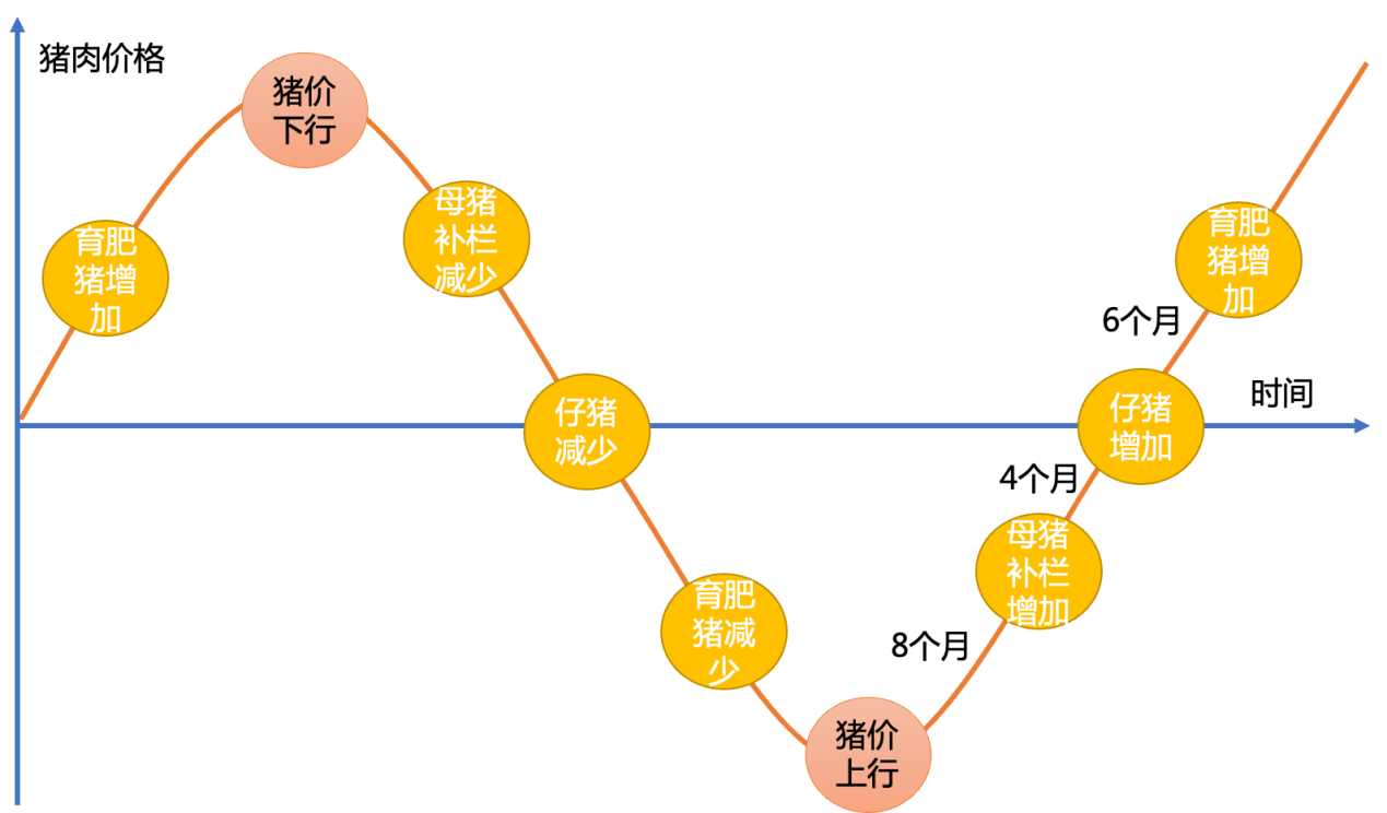 受市場供需的影響,豬肉價格通常表現(xiàn)出周期性。如圖3所示,在每一輪豬周期中,當豬肉價格上行時,母豬的補欄開始增加,這個過程大概需要8個月的時間;母豬成熟后開始產(chǎn)仔,大概4個月左右后能夠產(chǎn)生新一代豬仔;豬仔在出生后,最快6個月左右可以投放至市場;農(nóng)戶如果看好未來豬肉價格,那么將會繼續(xù)飼養(yǎng)部分生豬育肥,延緩生豬向市場的投放,將豬肉供給后置,不過,育肥的時間可能隨市場供需結(jié)構(gòu)變化而有所調(diào)整;當市場豬肉供給逐步開始超過需求后,豬肉價格將迎來下行周期,從而形成一個完整的豬周期。